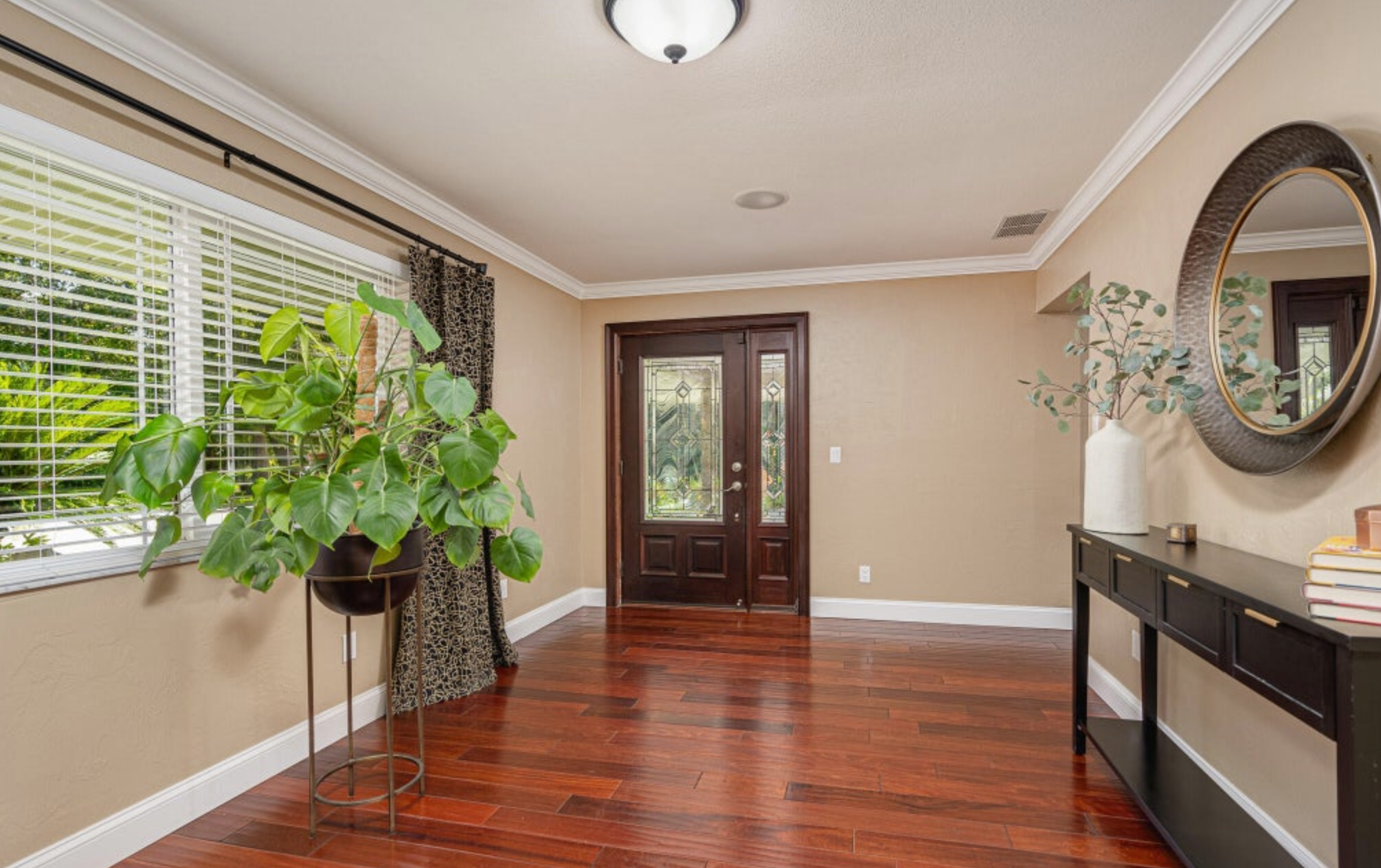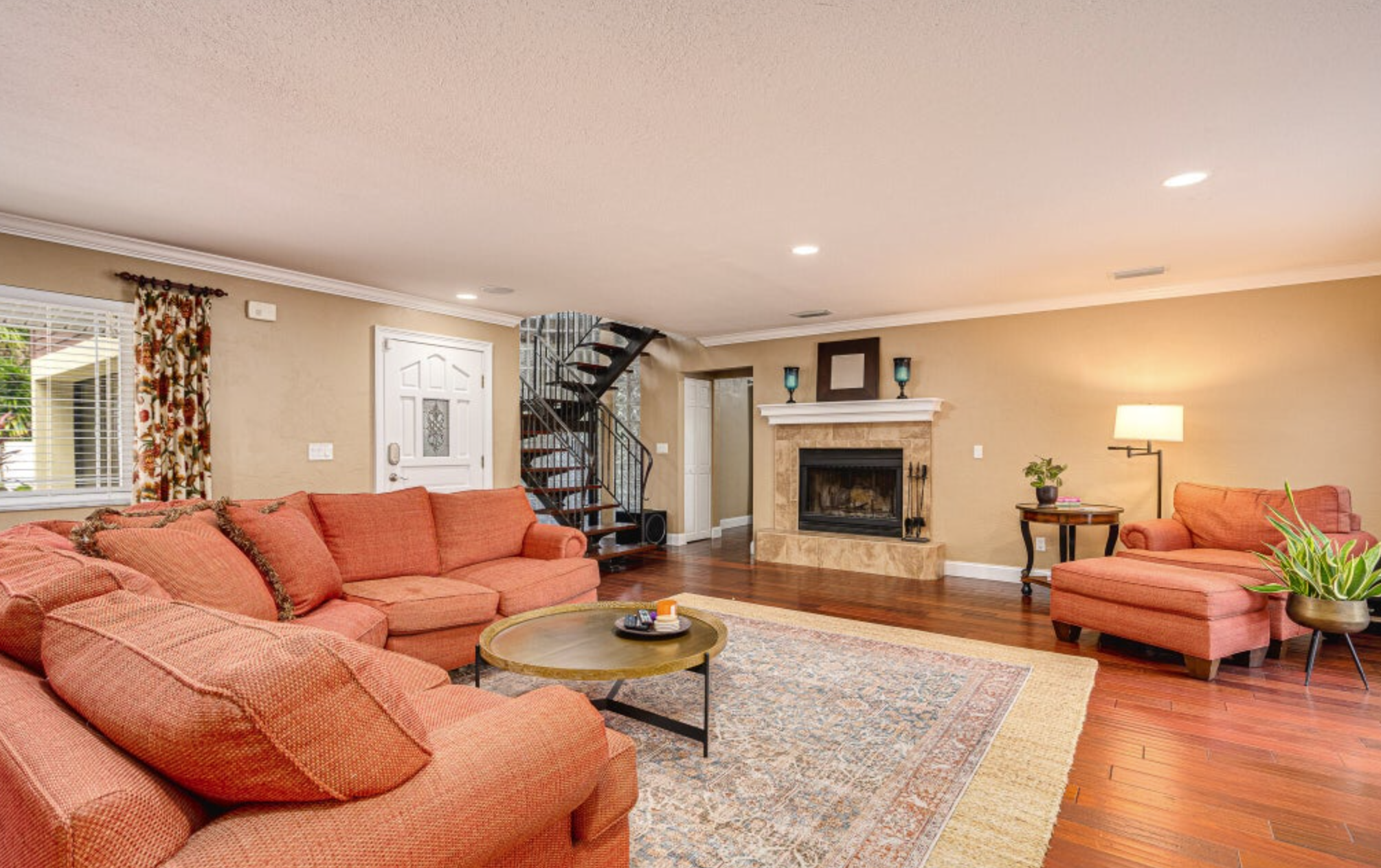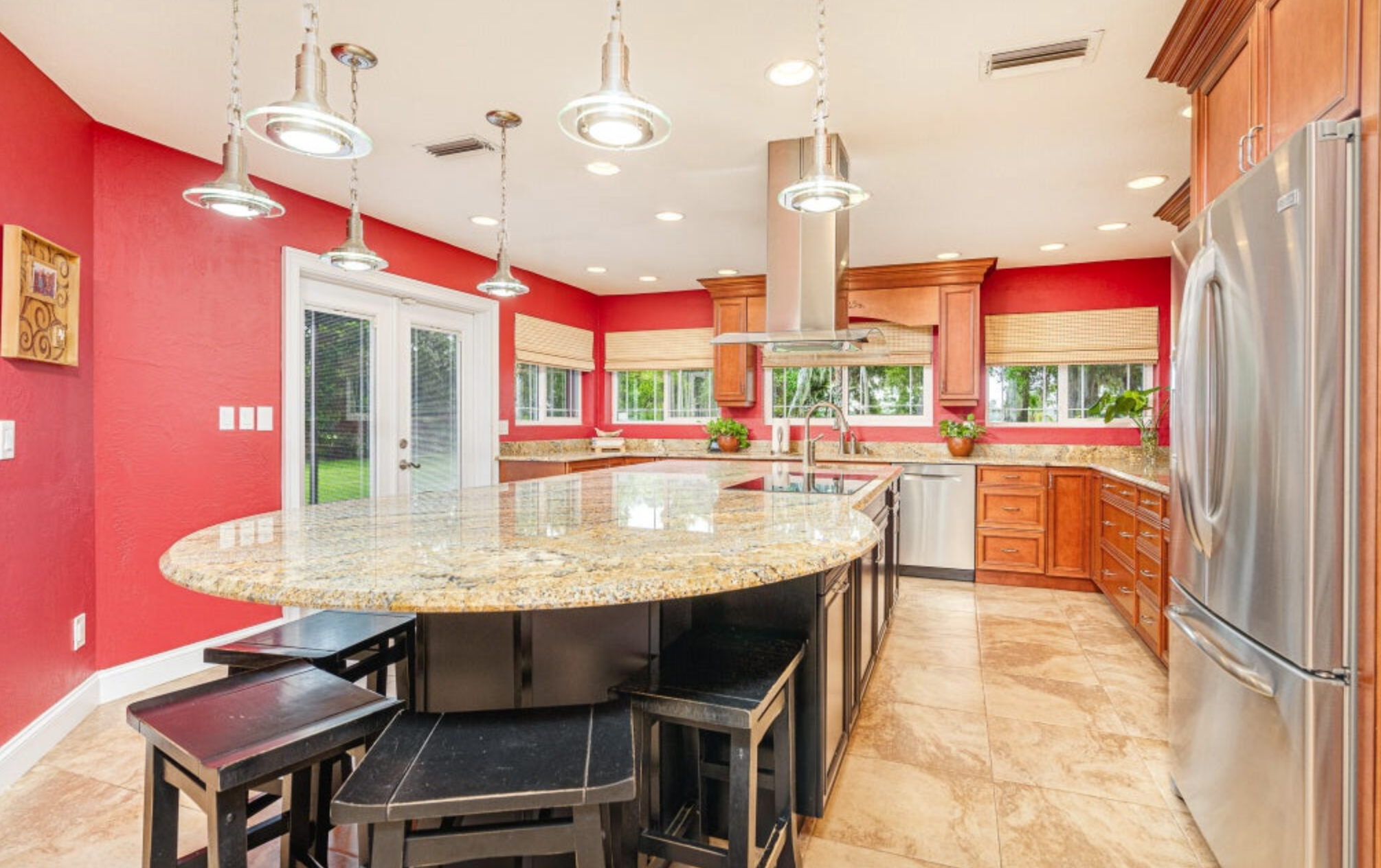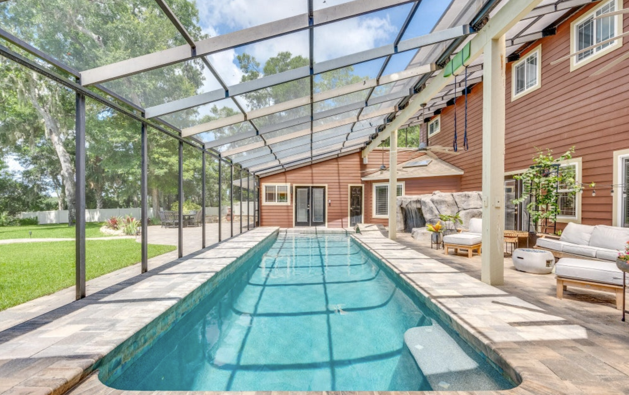 With only 80 homes in this highly sorted out neighborhood, you will be captivated by the home's grander, breathtaking views and boat access to the Spruce Creek River, which provides a gateway to the Intercoastal waterway and the Atlantic Ocean through Ponce Inlet. This stunning 4,614 square foot, five bedroom, three and a half bathroom estate is nestled at the end of the cul-de-sac - making you feel like you have arrived at your very own private resort. The 2.17-acre property boasts lush tropical landscaping which you will notice upon arrival. The house itself is perfectly positioned, maintained, and architecturally well-planned.As you enter the main house, you will notice the spacious entryway with a wood-burning double-sided fireplace that leads you to the open living room. From the comfortable living space, which is wired with a surround sound system throughout the first floor and pool area, you will experience what open-concept living and entertaining are all about.