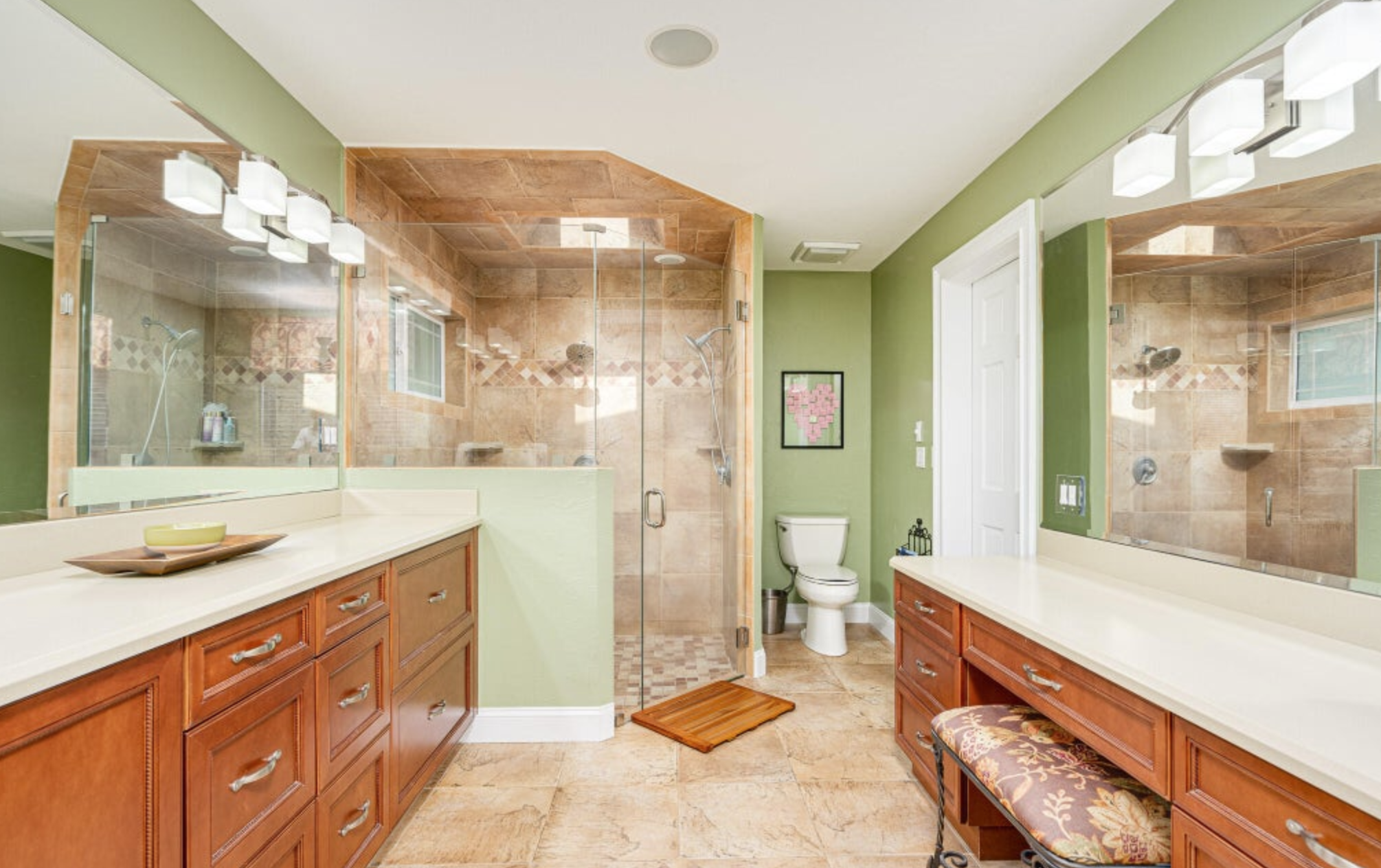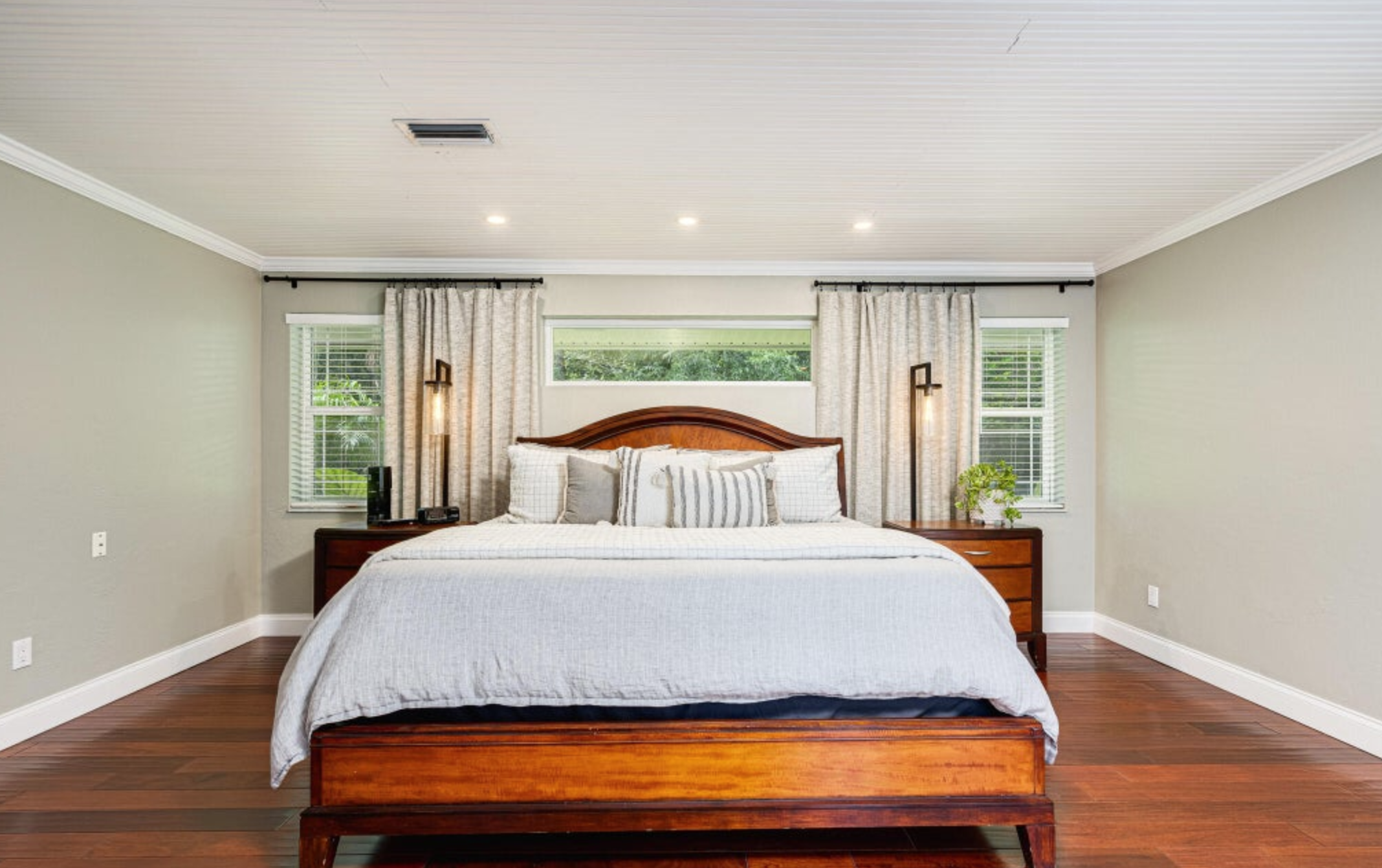 Also located on the first floor is a master suite wing, which will make you feel like you have stepped into a private oasis. The room itself is spacious and beautifully detailed with a bead board ceiling, skylights, sitting area, and stunning wooden floors. Flooded with natural light and access through French doors to the lanai - you will sleep soundly in this private wing of the home. The master bedroom has a luxury bathroom with a skylight above the walk-in shower, which boasts two shower heads and a place and relax, as well as a room-size walk-in closet. Just off the master bedroom, you will find a half bath and the 2nd bedroom, which is tastefully being utilized as an office but can be converted back to a bedroom by installing a closet.