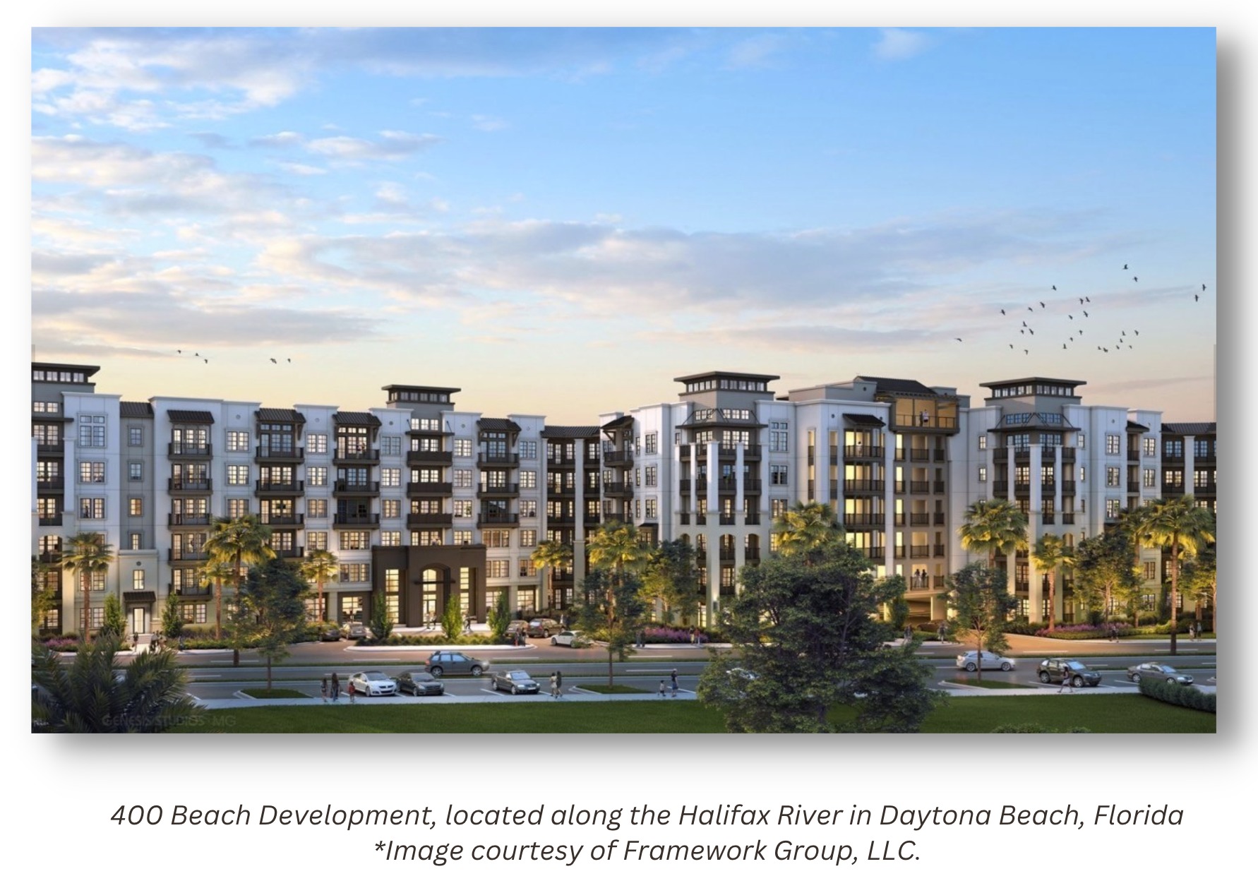 The new 400 Beach Street development, located on the Halifax River, in the heart of downtown Daytona Beach, is a 6-story development offering 294 upscale units. Mr. Molnar spent a few years assembling the land for the project. The 3.5 acre site was bought by the Framework Group, which will be developing the 500 feet of frontage on Beach Street.