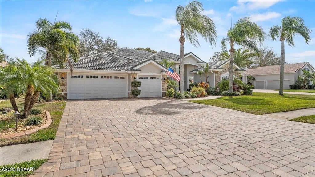 Welcome to luxury living in the prestigious estate section of The Sanctuary in Port Orange. This stunning home features soaring 14-ft ceilings, custom drapes, and a spacious pool patio perfect for entertaining. Enjoy peace of mind with numerous updates, including new insulated garage doors, a new hot water system, salt cell, and pool filter. The electric pool heater is newer and still under warranty, while sealed pavers and a backyard canopy create a private outdoor oasis. The lanai boasts a convenient half bath, making poolside gatherings effortless. Located in a desirable community, this home offers elegance, comfort, and the ultimate Florida lifestyle.