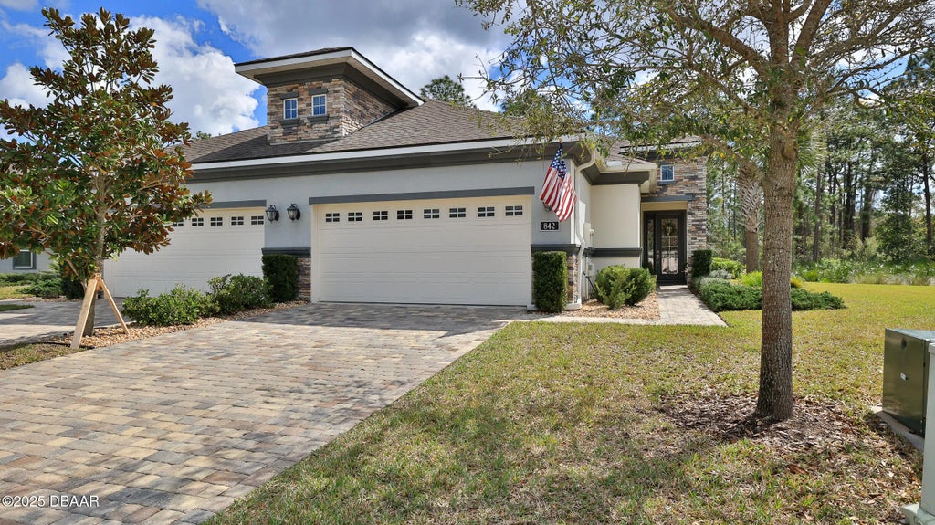 This beautifully maintained 2-bedroom, 2-bath, 2-car garage townhome with a dedicated office/den is situated at the end of a peaceful cul-de-sac in the highly desirable, gated community of Plantation Bay. As an end unit, the home enjoys extra privacy and is set against the backdrop of a serene nature preserve, with plenty of natural light pouring in throughout the home. Maintenance-free living is made easy, as the Prestwick Pointe subassociation covers the roof, exterior paint (scheduled for repainting this year), and landscaping. Enter through the upgraded glass front door into a well-appointed floor plan. The tastefully updated interior features 6-inch crown molding and plantation shutters throughout. Power blinds on the sliding glass doors enhance convenience and privacy while allowing you to easily access the outdoor space. The kitchen is a chef's dream, offering extensive granite countertops, stainless steel appliances, 42-inch cabinetry and a dedicated walk-in pantry. The spacious owner's suite includes two walk-in closets outfitted with California Closet upgrades, a walk-in shower, and dual sinks for added luxury. Both bedrooms are fitted with plush carpet for comfort, while the rest of the home is designed for easy maintenance. The guest room is equipped with Murphy beds, allowing for a flexible space that can easily transition from a cozy bedroom to a functional office or bonus room. Step through the triple, collapsible sliders onto a fully screened, covered lanai where you can relax and enjoy views of the preserve. The home also includes full cabinetry in the laundry room and ceiling storage racks in the garage. The prestigious Plantation Bay community offers a wealth of activities and amenities, including optional memberships for 45 holes of golf, a fitness center and pool, 9 Har-Tru tennis courts, 10 pickleball courts, 2 clubhouses, and 2 restaurants. The brand-new, 30 million Founders Clubhouse is a true gem within the community, offering even more opportunities to enjoy a vibrant, social lifestyle. This townhome offers the best of both comfort and convenienceperfect for anyone seeking a relaxing, yet active lifestyle in a picturesque setting.