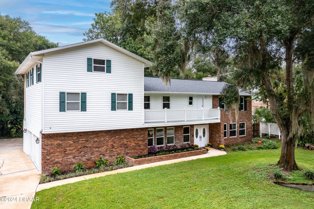 Wonderful custom build 4bed/3.5 bath home in Ormond Beach situated high on the bluff overlooking almost 3 acres backing to the Tomoka River in the desirable Tomoka Oaks subdivision! New features include all new LVP flooring on the main level, New Roof and New windows! Unique floorplan allows for formal dining & living and huge family room open to eat in kitchen. Fireplace and custom built-ins are the focal point of the family room w/french doors leading to outside covered lanai. Kitchen features-granite counters, wood cabinetry, pullouts/spice racks, glass fronts, coffee bar, wetbar & plenty of storage. Upstairs features 2 ensuite bedrooms and 2 guest bedrooms. Primary suite is fabulous w/soaring ceilings, hardwood floors, fireplace, private balcony, and huge custom closet and even a private 3rd floor office/gym. Primary bathroom dual vanities, large soaking tub, walk in shower and private water closet. Secondary ensuite bedroom is perfect for guests w/private front balcony. Guest bedrooms share a jack & jill bath and have all new carpeting. Exterior features-a large covered lanai perfect for entertaining outdoors and enjoying the wooded privacy of the property. 2 Car side entry garage w/plenty of extra parking -concrete pad for boat/rv or utility trailer. Inside laundry. Plenty of room to roam in this home! Great separation of space, loaded with storage and ready to move in! Backing to super private lush preserve which leads to the Tomoka River where with proper permitting it is possible to build a walkway and dock to enjoy the river. There is also room for pool or backyard putting green or deck for entertaining. Tomoka Oaks is located in the heart of Ormond Beach and has a voluntary HOA with no HOA restrictions other than the city of Ormond Beach restrictions. Close proximity to parks, recreation, shopping, Publix and several eateries. Just minutes to the beach,PICTONA-Pickleball, Outlet mall, highways, medical, airport and racetrack. Some photos have been virtually staged with furnishings.