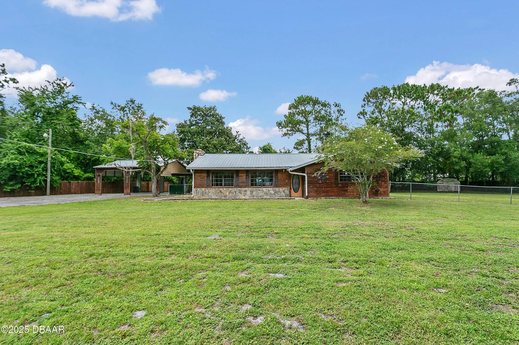 Welcome to 9 Sunny Rd., a cute 2-bedroom, 2-bath home and a versatile flex room that can easily serve as a third bedroom, home office, secondary living room or hobby space. Located conveniently on the outskirts of Ormond Beach, and sitting on just over an acre, this high and dry property offers comfort, functionality and a touch of rustic charm. Step inside to find a bright and inviting interior featuring durable vinyl flooring, fresh paint throughout, along with a cozy stone fireplace. The kitchen is a standout with granite countertops, ample cabinet space, and a seamless flow into the dining and living areas — perfect for entertaining. Enjoy your mornings on the screened-in back porch overlooking the quiet yard, or relax under the covered parking area, which adds convenience and protection. The home also features a metal roof, well and septic system, and plenty of outdoor space for gardening, recreational use or a future pool addition. Whether you're looking for a starter home, downsizing, or investing in a peaceful getaway near Florida's beautiful coast, 9 Sunny Rd. is move-in ready and full of potential. Don't miss this one! Square footage received from tax rolls. All information intended to be accurate but cannot be guaranteed.